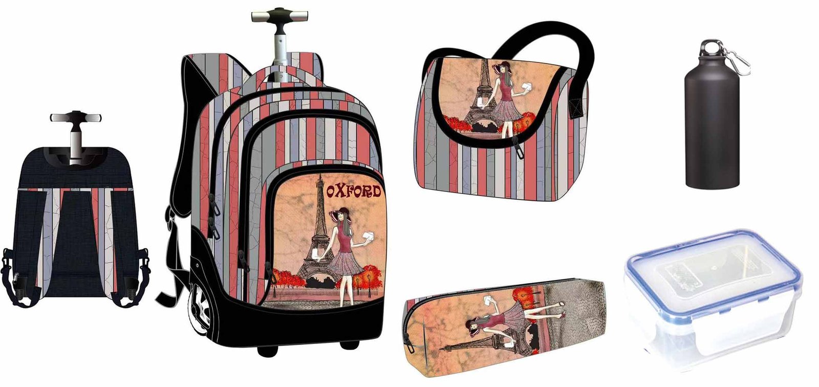 Versatile 5-in-1 set including a 2-wheel trolley backpack with a padded laptop compartment, lunch bag, pencil case, water bottle, and small backpack. Durable, spacious, and perfect for school or travel.