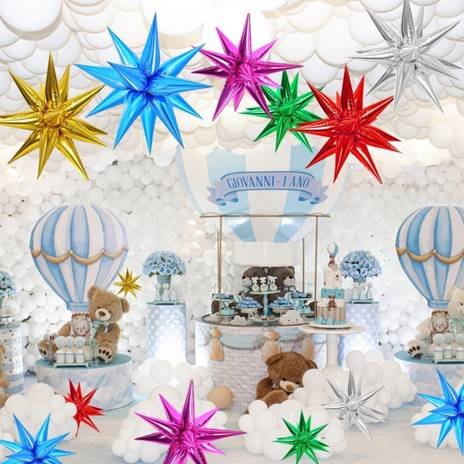 Eye-catching star-shaped decor pieces, perfect for adding sparkle to birthday celebrations. Lightweight, shiny, and easy to hang.