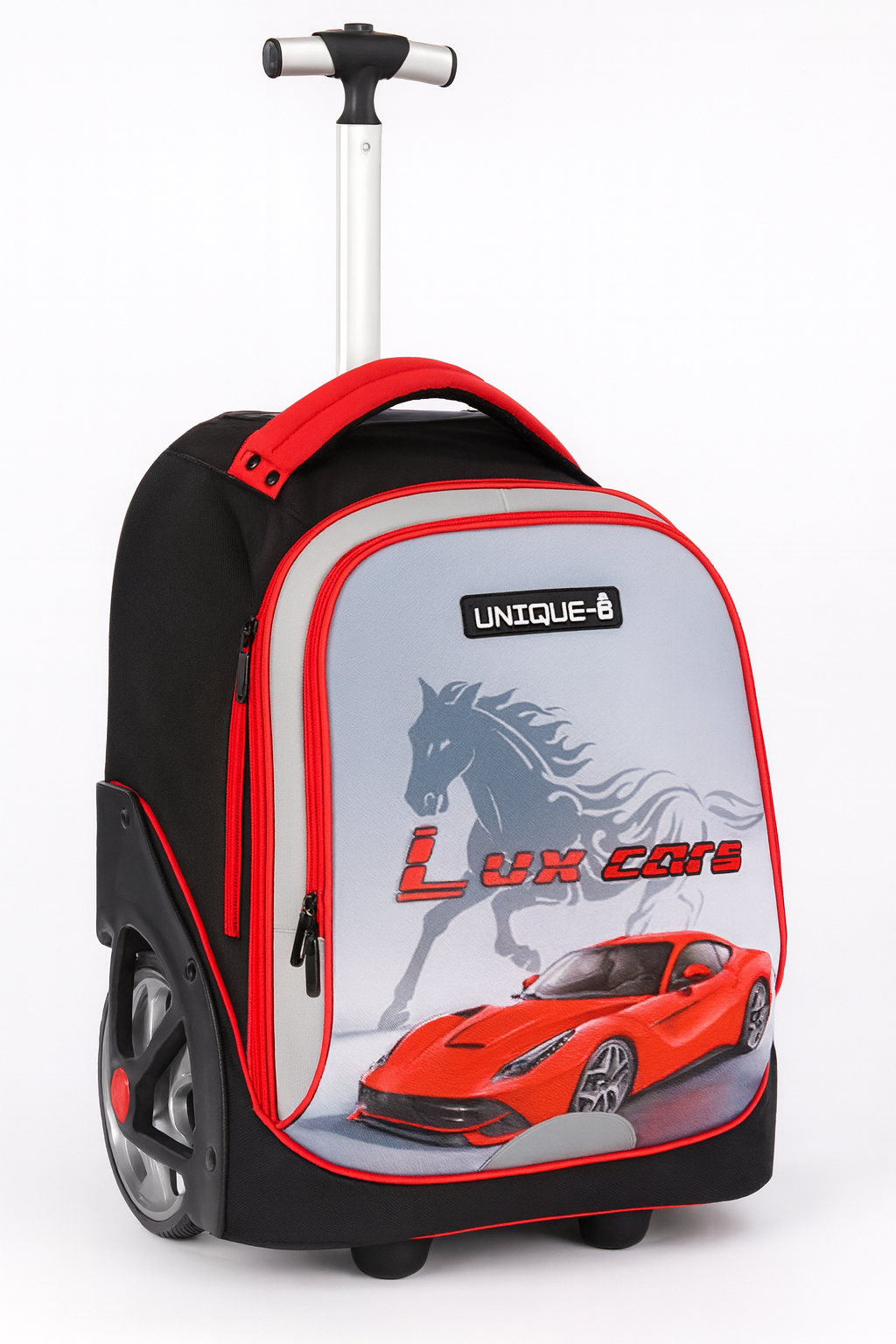 Premium trolley bag featuring a bold red design with luxury car graphics. Durable, spacious, and perfect for school or travel, combining style with functionality for young car enthusiasts.