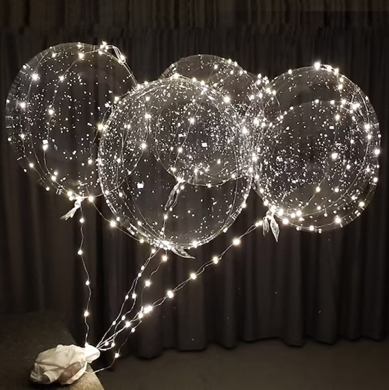 Clear balloon filled with sparkling sequins and glowing LED lights inside. Ideal for adding a festive, dazzling touch to parties, celebrations, and special occasions.